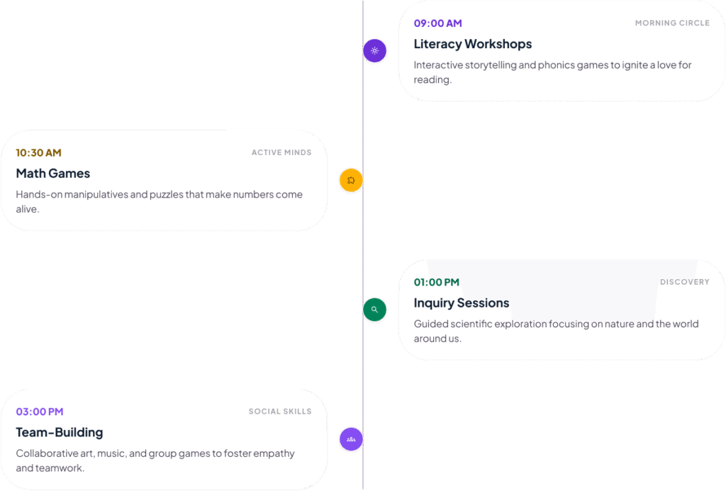 A balanced rhythm of focused learning and energetic play designed for 3-4 year olds.